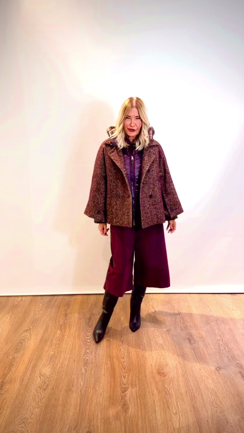 Picot in lana doppio petto ,trapuntato all'interno, lughezza al fianco , manica leggermente scampanata , tasche sul davanti, colore bordeaux