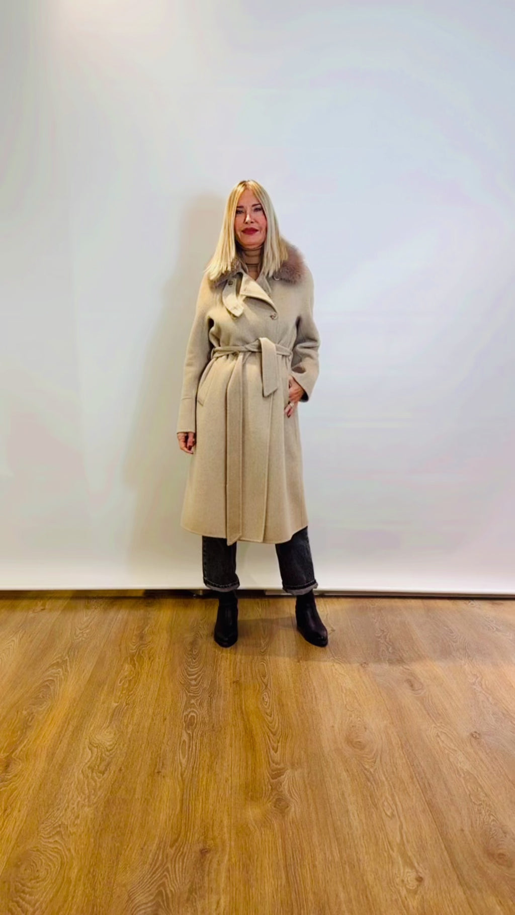 Cappotto doppiopetto , con cintura in vita e collo in eco pelliccia staccabile , tasche a filetto syl davanti.