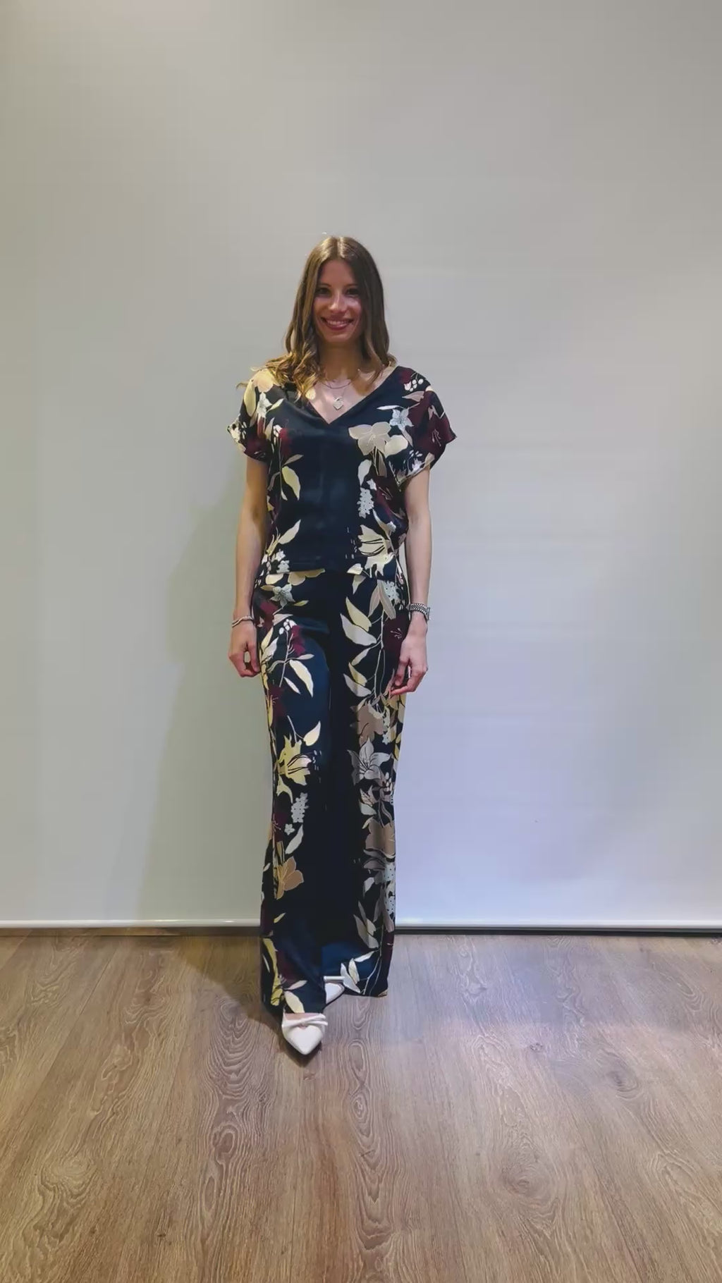 Completo a fiori composto da pantalone a palazzo con elastico in vita e zip nascosta laterale e camicia mezza manica con scollatura a V.
