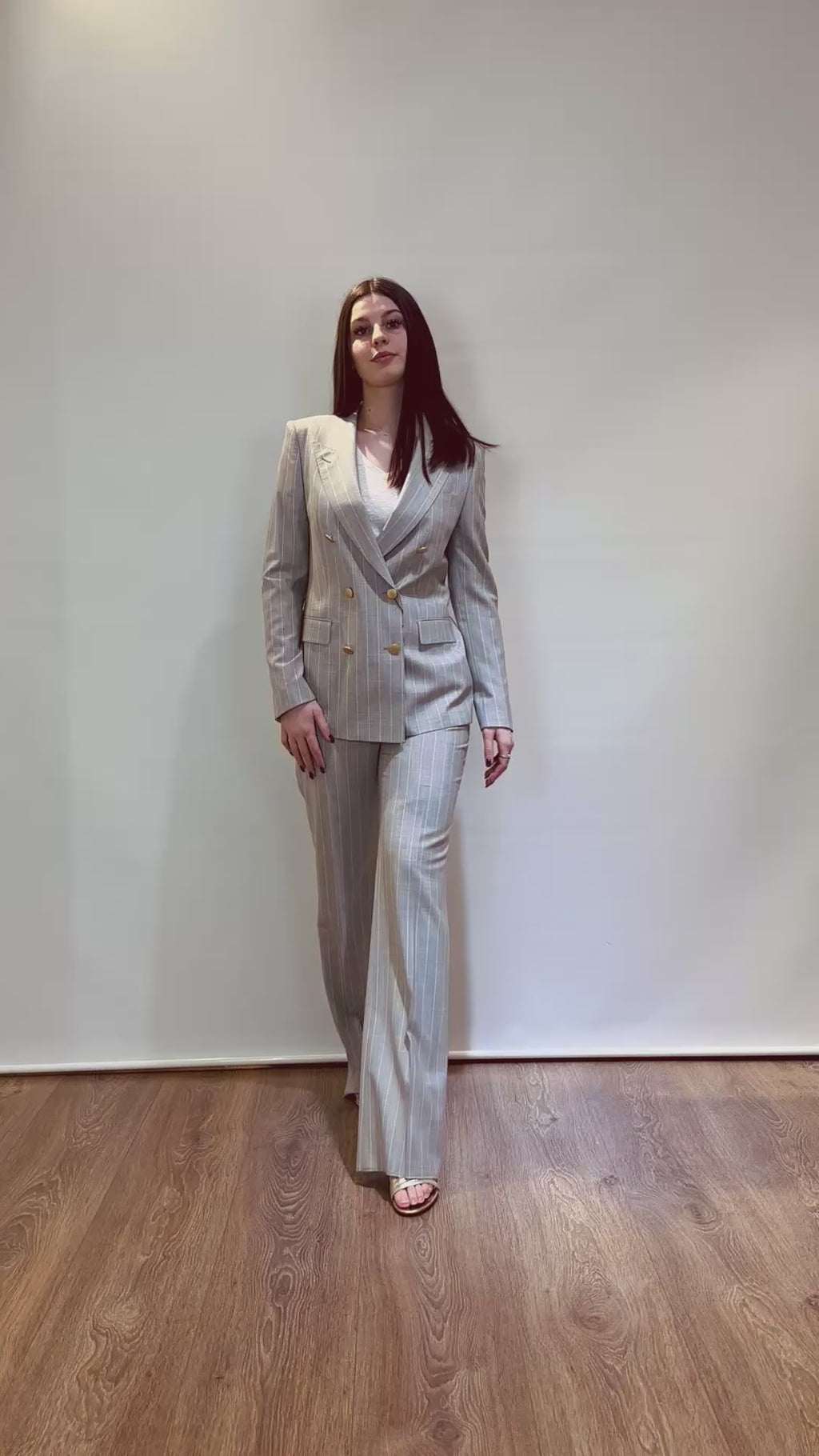 Completo Tagliatore grigio perla con gessatura off white , giacca modello Parigi doppiopetto con bottoni in metallo dorati , pantalone palazzo , senza pinces .