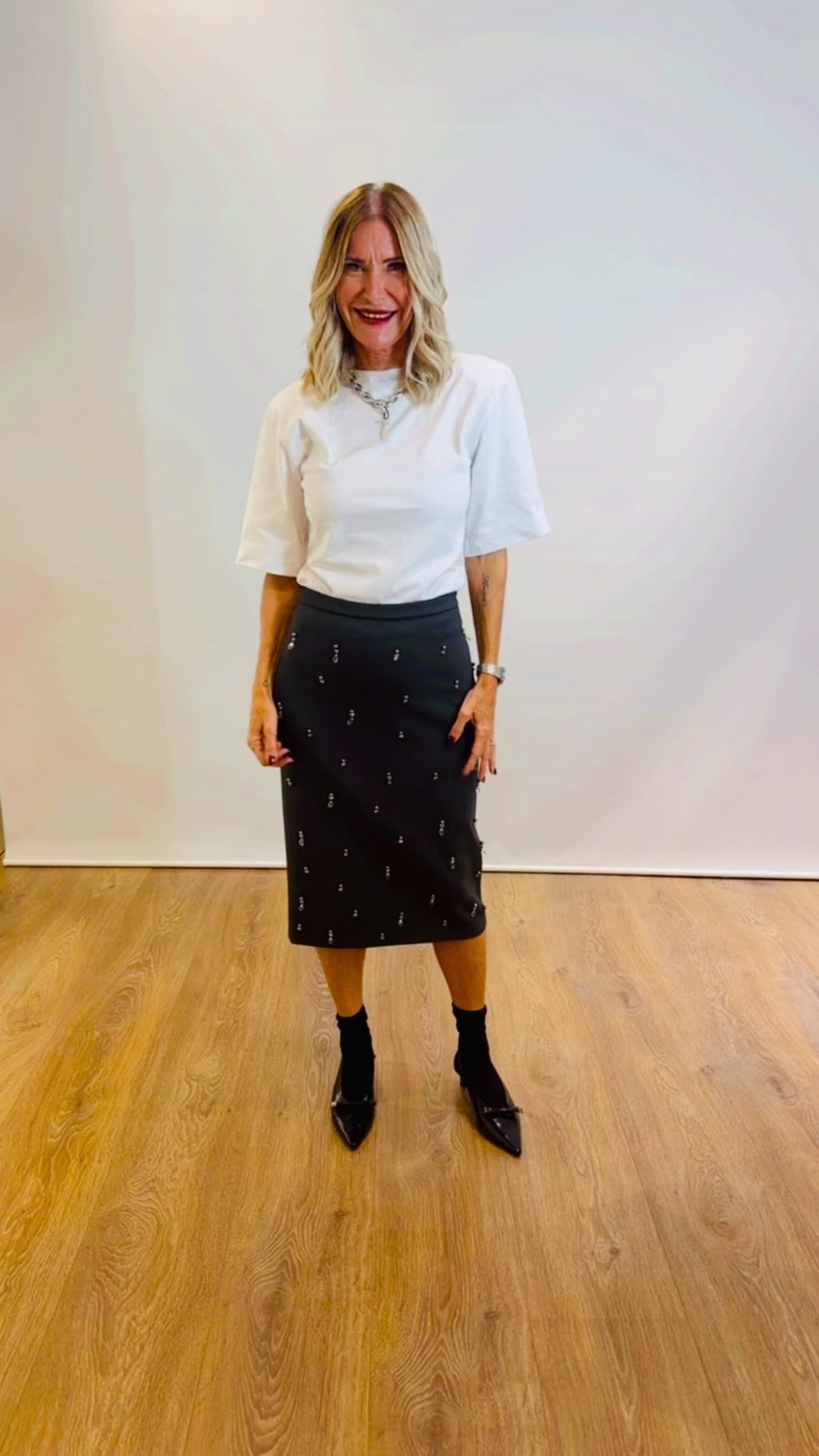 Gonna midi a tubino con applicazioni sul davanti , zip sul fianco .