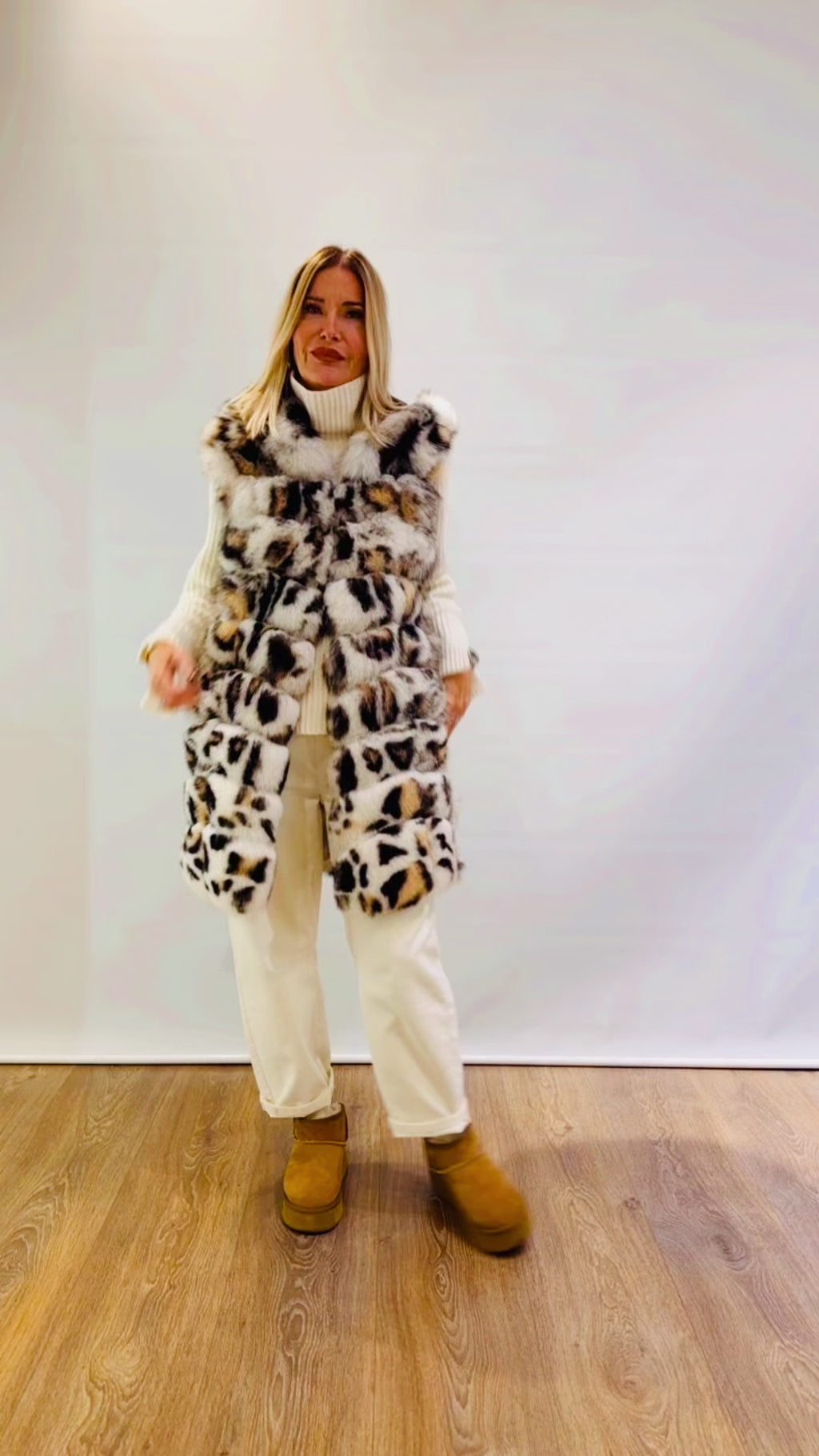Pelliccia smanicata in vera volpe effetto maculato con cappuccio