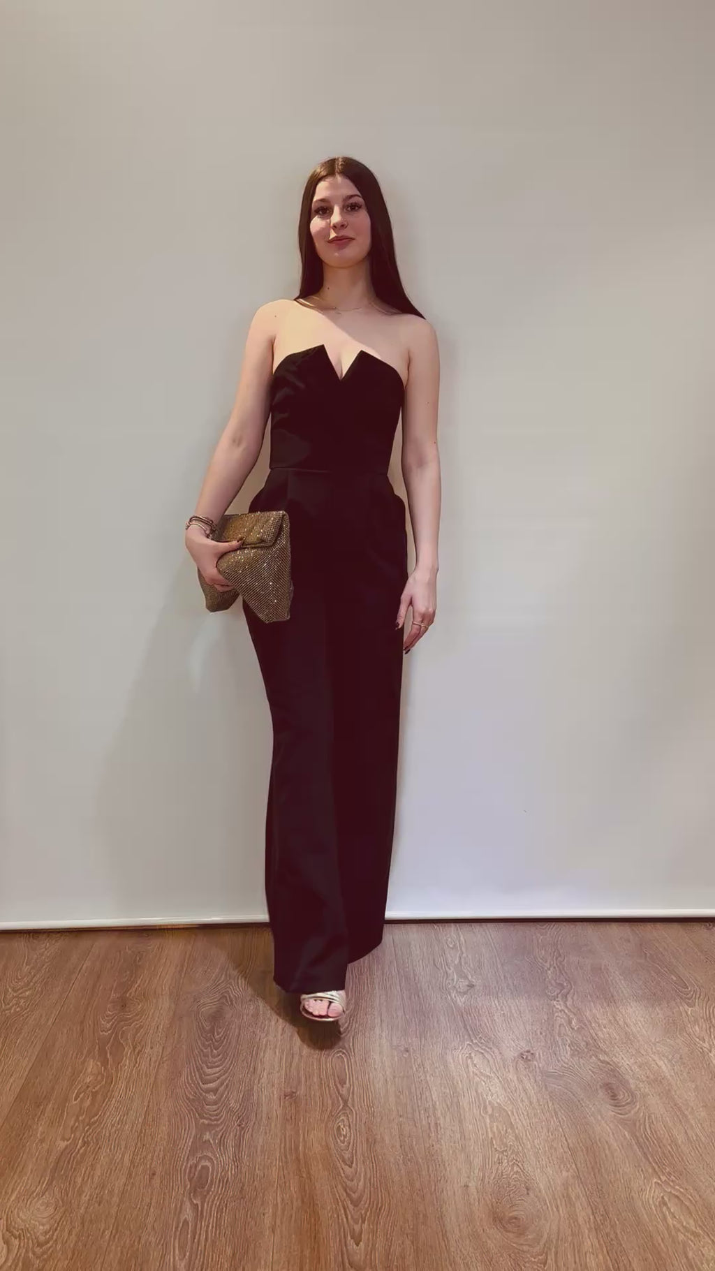 Tuta con spalle fuori motivo spacco sulla scollatura davanti , pinces e pantalone palazzo.